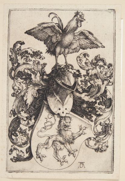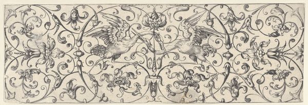 Editor: This is "Frieze with Eros and a Siren" by Agostino Veneziano, created around 1530. It’s an engraving, and the level of detail is really striking. The mythological figures—Eros, the Siren, the eagle—are interwoven with this elaborate vegetal design. It's quite intricate. What's your take on it? Curator: Considering its materiality, the very act of engraving transforms a metal plate—likely copper—into a matrix for endless reproduction. This disrupts traditional notions of artistic authorship. Agostino Veneziano, the *engraver*, isn't necessarily the *inventor* of this composition. His labor resides in the meticulous translation onto the plate. Think of the skilled artisan; their ability determined the aesthetic success and thus, the cultural currency of the image. Editor: That's interesting. So, you’re focusing less on the mythologies portrayed and more on the printing process itself? Curator: Precisely. What does it *mean* that this scene, possibly designed by another artist, becomes accessible to a wider audience? These prints weren't destined for a gallery; they likely adorned everyday objects or served as inspiration for other artisans. How does mass production impact the perceived value of artistic labor, blurring the lines between "high" art and artisanal craft? Editor: So it challenges our modern ideas about unique art objects... Curator: Exactly. The very intention of this print was to be reproduced and circulated widely, becoming part of a broader decorative and visual vocabulary of the Renaissance. Editor: That really shifts my perspective. It's no longer just a mythological scene, but also a comment on artistic production. Thanks, that’s insightful. Curator: Indeed, considering the material process expands our understanding of cultural circulation and the democratisation of images.