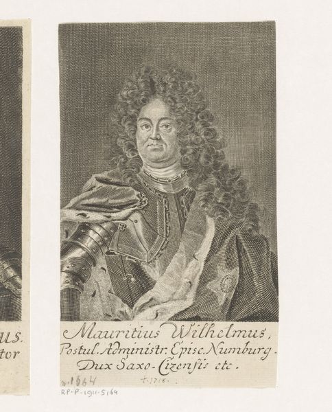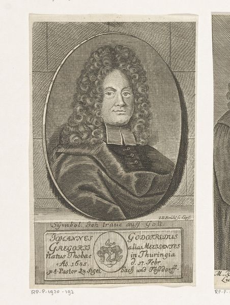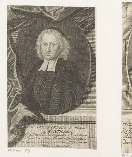 Editor: Here we have the "Portret van Johann Friedrich Winckler," created in 1713 by Martin Bernigeroth. It's an engraving, so primarily line work, and has this fascinating oval composition. There’s a stillness to it that’s striking. What catches your eye when you look at it? Curator: Formally, I am drawn to the artist's manipulation of line and the resulting tonal range achieved in this print. Note how the density and direction of the engraved lines meticulously sculpt the subject’s face, suggesting volume and texture. Do you see how the artist creates depth simply by varying the marks on the page? Editor: Yes, especially in the folds of the ruffled collar. But I also see this interesting tension between the flatness of the engraving and the three-dimensionality they're trying to create. Is that deliberate, do you think? Curator: The flattening effect is, I think, inherent to the medium itself. Bernigeroth doesn’t entirely conceal this, rather he utilizes the characteristics of engraving. Notice, for instance, the strategic placement of hatching lines to construct spatial depth while simultaneously acknowledging the two-dimensionality of the picture plane. How does this affect your reading of the image? Editor: It's almost like the flatness emphasizes the artifice of portraiture itself, reminding us that this is a constructed image. It almost turns it into a study of lines and texture, more than a true representation of an individual. Curator: Precisely. This work functions as a signifier – a system of carefully constructed lines and forms which produce meaning. Consider the lines surrounding the face—they point inward and call more attention to it, underscoring how portraiture captures something of an individual’s identity through strategic representation. Editor: I see. The art isn't necessarily about capturing an exact likeness, but using artistic means to construct meaning and ideas about the subject through these carefully chosen details of line, tone and texture. Curator: Exactly. And in doing so, we reveal the artist’s hand in shaping how we understand the subject and how closely looking reveals their careful method.