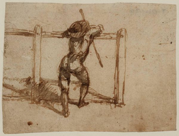 Editor: Here we have Hendrick van Beaumont's 1696 pencil drawing, "Man steunend op een stok en een man met de handen op de rug." The figures feel a bit cartoonish, almost floating on the page. What do you see when you look at this piece? Curator: I observe the stark lines etched into the paper, defining two figures in isolation. The use of line, seemingly simple, in fact dictates our reading of form and depth. Consider the upper figure: the implied curvature of his back and limbs comes solely from subtle shifts in tonal density achieved through the pencil strokes. It’s an exercise in minimalist representation. Editor: So it’s about how little Beaumont uses to convey so much? Curator: Precisely. Note also the texture implied by the hatching on the figures' clothing, a contrast to the smooth expanse of the paper around them. The paper is as much a part of the composition as the graphite itself, creating a tension between the depicted and the void. Editor: The composition is interesting too – almost like two studies placed together, unrelated. Curator: Indeed. Their disconnection invites speculation. Are they intended to be characters in the same narrative, or simply studies of posture and expression? The relationship hinges purely on their shared visual field, not any explicit narrative connection. The very open nature of this work’s semiotics begs the question – does it imply an intrinsic relation or are we inclined to seek cohesion in disparate elements? Editor: I see what you mean. I originally just saw them as a humorous, separate sketches but considering their relationship through form is an intriguing reframing. Curator: This reveals how crucial it is to analyse form – line, texture, composition, not as ancillary features, but as primary drivers of meaning.