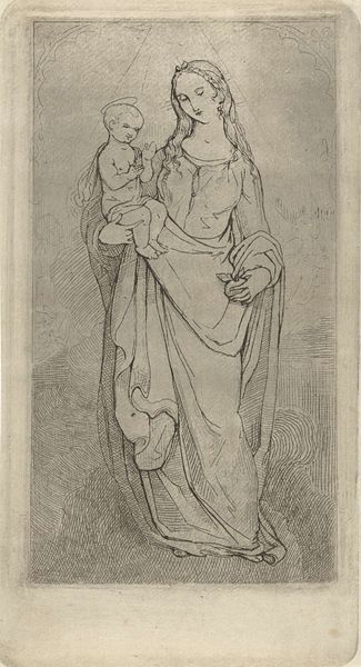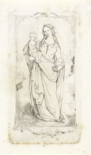 This delicate line drawing of the Virgin Mary and Child is by Theodoor Schaepkens. Schaepkens, who was born in Maastricht, would have been working during a time of growing national consciousness. This image of Mary cradling the Christ child speaks to the idealized role of women in 19th-century Europe, where motherhood was placed at the center of feminine identity. There is a quietness here. Mary's gaze is lowered and her features are soft, embodying a gentle femininity. The Christ child in her arms, embodies innocence and purity. However, If we look beyond the surface, we might question the weight of expectation that such images place on women. Are they icons of love, or silent projections of social ideals that define and perhaps confine the identities of women? This drawing invites us to reflect on the complex relationship between representation, identity, and lived experience.