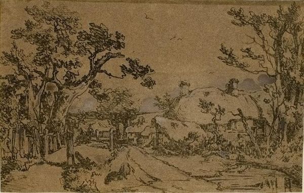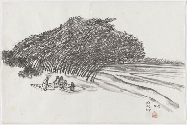 Curator: Take a moment to observe "Enjoying the Pines" by Shen Zhou, dating back to the Ming Dynasty, sometime between 1368 and 1644. This ink on paper drawing invites us into a serene landscape. Editor: It strikes me as a very introspective piece. The lone figure seems quite small amidst the vastness, almost swallowed by nature's grandeur. It projects a feeling of profound isolation, yet peacefulness at the same time. Curator: Absolutely. The figure’s placement embodies the Daoist principle of finding harmony with nature, a visual representation of withdrawing from the world to contemplate deeper truths. Consider how the pine, a symbol of longevity and resilience in Chinese culture, looms protectively. Editor: And it isn’t just longevity; it speaks to the endurance of cultural values even in the face of social and political upheaval. The scholar's retreat can also be viewed as a form of silent protest or critique of the imperial court, a place for independent thought. Curator: Precisely, it becomes a symbol for artistic and intellectual freedom. This drawing reminds me of similar hermit motifs appearing in later literati painting; the image becomes a stage to show erudition through simplicity. Editor: I agree. Even in the starkness of the monochrome, we discern coded social commentary. How do we reconcile these elite aesthetic values with larger communities outside this scholar-official class? Does this representation serve only to uphold traditional hierarchies? Curator: The question raises pertinent issues on who art history benefits in its telling, right? Despite such challenges, it reminds us of enduring virtues. Perhaps this solitary figure is a mirror reflecting the audience and what values they strive toward. Editor: Perhaps. It’s still intriguing how enduring the image of the recluse remains as a potent symbol even today, as we continuously evaluate our place in rapidly evolving societies. It remains a quiet testament to introspective and thoughtful dissent. Curator: Indeed. Even centuries later, we return to this tranquil scene. Editor: Food for thought for many centuries to come, I'd say.