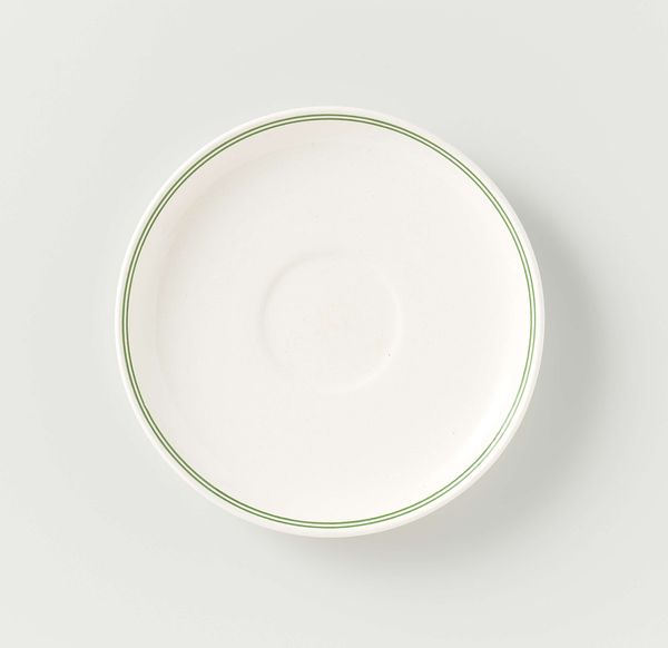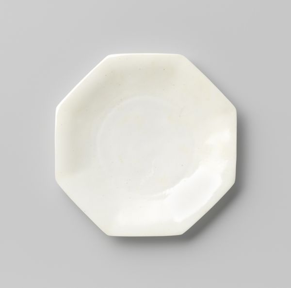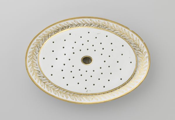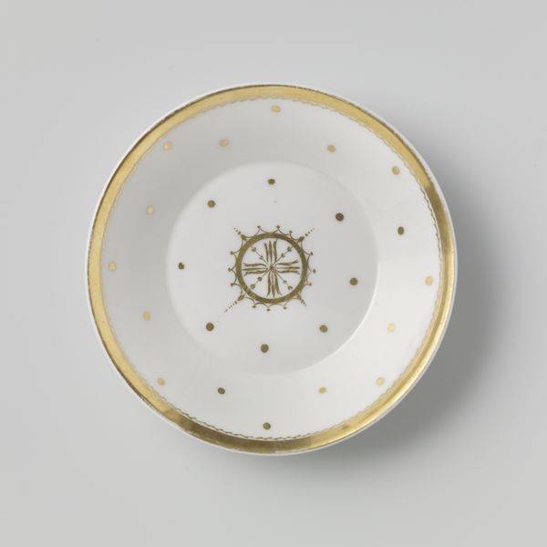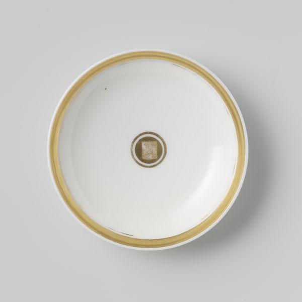 Editor: This is "Wilhelmina en Wellington," a porcelain ceramic plate made around 1814 by Adrianus Johannes Bik. It's deceptively simple—just a white plate with gold trim and a small central image. It feels very… formal and commemorative. What historical narratives are embedded in this object? Curator: It's more than just decorative, isn't it? This seemingly simple object speaks volumes about power, alliance, and the performance of patriotism. Think about the context: 1814. Napoleon had just been defeated. What do you imagine the cultural atmosphere would be? Editor: Probably relief, and a desire for stability. This plate seems to celebrate…Wilhelmina and Wellington, but why put them together on something so everyday? Curator: Precisely. Wilhelmina, Princess of Orange, representing the restored Dutch monarchy, and Wellington, the British Duke, the hero of Waterloo. The placement of their portraits on a *plate*, of all things, indicates a desire to bring these figures, and their symbolic importance, into the domestic sphere. It's a form of cultural propaganda, would you agree? Editor: That’s fascinating. So it’s not just about remembering history, but about shaping public opinion within the home. But is the use of porcelain significant? Curator: Absolutely. Porcelain itself was a luxury item, symbolizing wealth and good taste. Using this expensive medium to create a portrait reinforces the high status of the figures. Ownership of this plate became a silent declaration of political allegiance, doesn’t it? Editor: I see. So it’s like saying, “I support the new order” by displaying this seemingly innocent plate. That’s a powerful statement for a dish. Curator: Indeed. It transforms something ordinary into a potent symbol. We learn about art and history, but it invites us to look closely and consider who art impacts and why. Editor: Thank you, this completely changed my perspective on what I thought was just another plate.