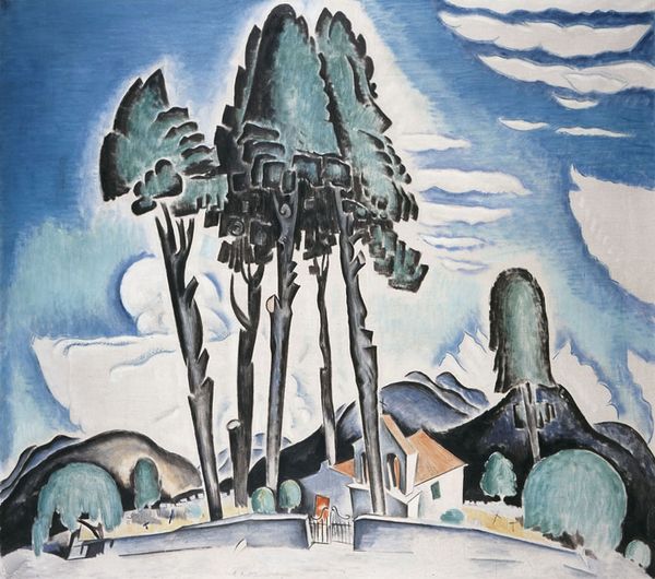 Curator: John Craxton painted "Hotel by the Sea", and it's now held in the Tate Collection. The painting presents a geometric landscape with a building looming above the coast. Editor: It's quite striking, isn't it? Almost dreamlike with its fractured forms and subdued palette. There's a sense of isolation in the scene; a stark contrast between the man-made structure and the natural world. Curator: Indeed, the fractured planes call to mind Cubism, yet the symbolism feels deeply personal. Look at the goat, a recurring motif in Craxton's work, often associated with freedom and pastoral life. It's a rejection of the city. Editor: I see a tension between the utopian ideal of the hotel and the reality of the landscape; perhaps a commentary on the impacts of tourism or development on the natural environment and local communities. Curator: Or maybe, through the distorted perspective and symbolic figures, Craxton offers a glimpse into an inner world, reflecting on the human condition within a broader landscape of history and culture. Editor: Either way, it prompts us to question our relationship with the environment and the spaces we create within it. A silent call for stewardship, perhaps.