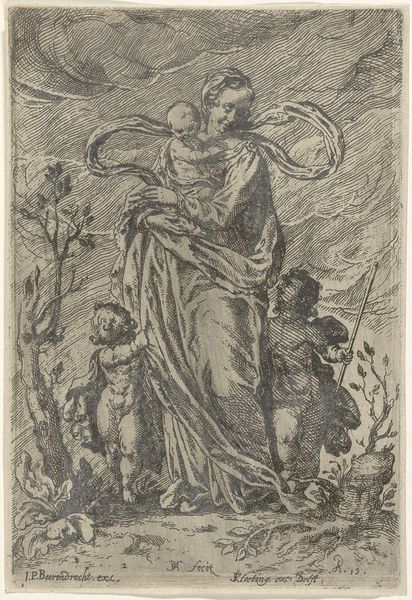 Pieter Feddes van Harlingen created this print titled 'Geloof,' or 'Faith,' in the Netherlands. Although undated, the print likely originates from the mid-17th century. It allegorically depicts the Christian virtue of faith, embodying abstract ideals through human form. The figure holds a cross, the central symbol of Christian belief, and what appears to be a flail, referencing the power of punishment and judgement. Prints like this one were widely circulated across the Netherlands. They were often commissioned by religious institutions or wealthy patrons as a means of reinforcing social order, by presenting religious virtues as ideals to aspire to. It's important to remember that artistic production wasn't simply a matter of individual creativity, but was deeply entwined with the social and political structures of the time. By delving into archival records, religious texts, and social histories, we can better understand the complex interplay between art, faith, and society in the Dutch Golden Age.