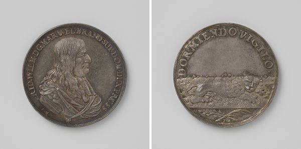 Curator: This is an engraving on metal from 1748. It portrays Anna van Hannover, Princess of Orange-Nassau. Editor: It's quite striking! The silver-grey sheen of the metal, the raised relief... It feels simultaneously grand and intimate, like holding a moment of history in your hand. Curator: Exactly. These medals served as public declarations and commemorations. This one likely references Anna’s role and influence. The portrait is a statement of power, but it's also embedded in a broader political landscape. Editor: I notice on the reverse side, there is what appears to be a depiction of a classical figure standing before an altar with plumes of smoke, perhaps an allegory of piety and answered prayers. It's so overtly symbolic, how do we interpret it today? Curator: Think about the period’s embrace of allegory. These symbols conveyed messages understood within court and aristocratic circles. Anna was a significant figure; daughter of a British king and wife of a Dutch stadtholder. Her political savviness and her familial connections made her a key player. The engraving promotes that role. Editor: Yes, but did ordinary people really understand this visual language? How did this carefully constructed image of female authority play into the broader socio-political climate of the Dutch Republic at that time? This work speaks to more than just political clout; it's about gender, power and representation. Curator: The imagery served its purpose, circulating among those invested in upholding the existing power structure, reinforcing that very system. Think about the cost and skill involved; this object communicated power through materiality as much as imagery. Editor: And who were those upholding it and who were impacted by the power it was reinforcing? It encourages critical reflection on the past and the narratives we inherit about influential figures. Curator: Precisely. This work functions as a lens through which we view a specific historical moment and the way power was asserted and visualized. Editor: Reflecting on this artwork's visual elements invites considerations of societal expectations and constraints for royal women during the 18th century. Thank you for the insightful experience.