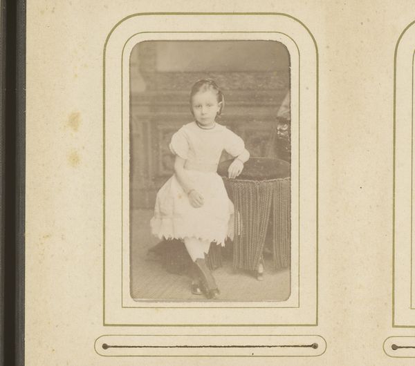 This is a photograph titled 'Portrait of a Girl' by William Edward Kilburn. The visible image measures 9.1 by 6.5 centimeters. Encased, the picture is a study in miniature proportions and pastel hues, where a young girl’s formal pose is softened by the whimsical use of colour. Kilburn’s composition utilizes a formal structure with a delicate balance of elements. The girl, positioned slightly off-center, is anchored by a chair to her left, while a backdrop of sky with clouds creates a sense of depth. The use of pink in her dress, echoed in the flowers she holds, suggests a carefully constructed visual rhyme, inviting us to consider the underlying themes of innocence and cultivated beauty. The photograph invites discourse around representation, class, and the evolving notions of childhood during the Victorian era. The formal arrangement and subtle colour palette converge to form a complex interplay of signs. This speaks to the cultural values and aesthetic sensibilities of the period.