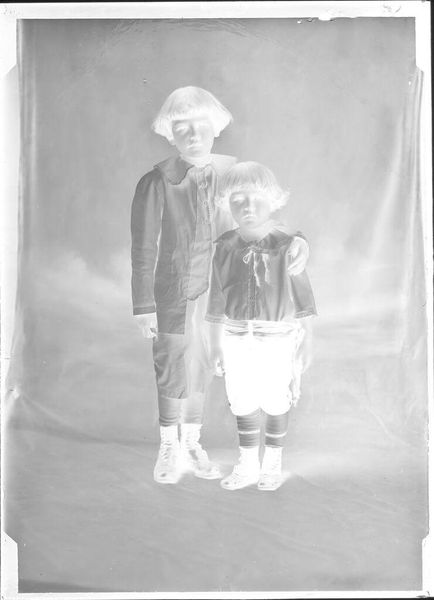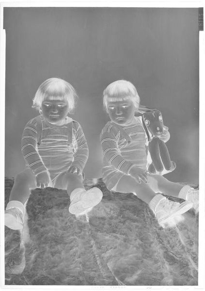 Editor: This is an intriguing vintage photo, "Untitled (two children in cowboy outfits)" by John Deusing. The reversed tones of the negative give it an eerie feeling. I'm curious, what stands out to you? Curator: The focus on clothing and props is interesting. Consider the labor involved in making those outfits, the accessibility of such costumes. What commentary might Deusing be making about mass production and the commodification of the "Wild West" image? Editor: That’s a great point! I hadn’t thought about it in terms of consumerism. Curator: And the photograph itself – a mass-produced item, documenting the consumption of another. What does it say about our relationship to fabricated identities? Editor: It's fascinating to consider the layered materiality – the fabric, the toys, the photographic print – all contributing to the image's message. Thanks!