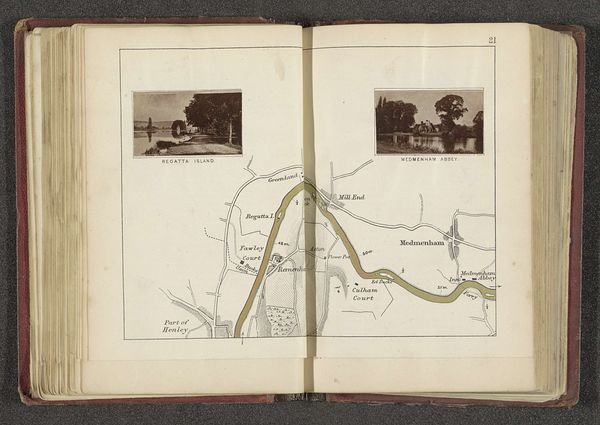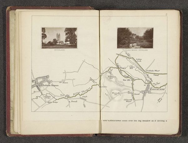 Editor: Here we have Henry W. Taunt's "Kaart met drie afbeeldingen van plaatsen langs de Theems," a print with ink and pencil, dating from before 1879. It has a charmingly antiquated feel, with its delicate renderings of the river and surrounding landscapes. What catches your eye? Curator: This piece whispers of the persistent human desire to map and capture our surroundings, doesn’t it? The combination of map and picturesque vignettes suggests more than just a geographical record. Think about how water, rivers specifically, feature in myth, folklore, and even the collective unconscious. What associations do these images along the Thames evoke for you? Editor: I guess I see it as a pretty record of places, perhaps for someone planning a trip? The little pictures are like postcards. Curator: Consider the cultural significance of the Thames itself. It’s not just a river; it's a vein through England’s history, bearing witness to centuries of commerce, conquest, and cultural exchange. Do these specific locales – Weybridge, Walton, Sunbury – have particular resonance in English identity? Were they significant trading posts, sites of battles, or perhaps associated with literary or artistic movements? Taunt's choice of locations speaks volumes. Editor: That’s a side I hadn’t considered – how intertwined places can be with history and memory. I was focused on the surface. Curator: And isn’t that the joy of art? To continually uncover new layers of meaning. It's a dialogue across time. This piece, seemingly simple, is dense with potential readings about place and identity. Editor: I will remember to dig deeper beyond my first reaction in the future. Thank you.