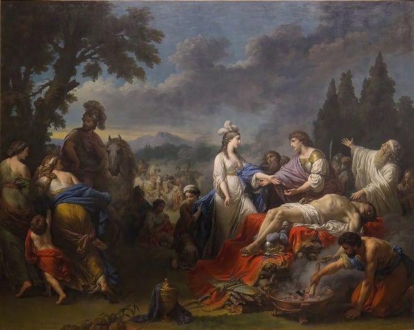 Editor: Here we have Johan Mandelberg’s “Hyrdescene” from around 1760, rendered in oil paint on canvas. It’s…oddly serene? The sheep give off this docile energy and there’s a couple in what looks like an intimate embrace in the foreground. What strikes you when you look at this painting? Curator: Well, it whispers sweet nothings of pastoral fantasies. That couple? They’re practically posing for a romance novel cover, all soft light and whispered promises under the watchful eye of...a rather baroque fountain spewing water, no less. Notice the sheep, too. More like fluffy, well-behaved clouds than actual farm animals, wouldn't you say? It’s like stepping into a confection, all powdered sugar and polite sighs. Editor: Confection is the perfect word for this piece. But how much of this…let’s say "idealized" version of country life was real, or was it just escapism? Curator: Ah, the eternal question, isn't it? It’s the Rococo period showing off. Think less gritty realism and more a yearning for a simpler, perhaps imagined existence. Courtiers playing at being shepherds – a temporary retreat from the gilded cages they were born into. Do you see it as entirely disingenuous though? Editor: Not entirely. I guess I appreciate the…hopefulness? Even if it is a little silly. Curator: Exactly. There’s a charm to it, isn't there? A testament to our enduring human need for beauty, even when filtered through rose-tinted spectacles. Plus, those sheep *are* undeniably cute! Editor: I agree, the sheep are undeniably cute. This made me see beyond just an unrealistic painting to the inherent appeal of idealizing things, however briefly. Curator: And it's a reminder that even amidst societal frippery, art can tap into some universal longings for tranquility.