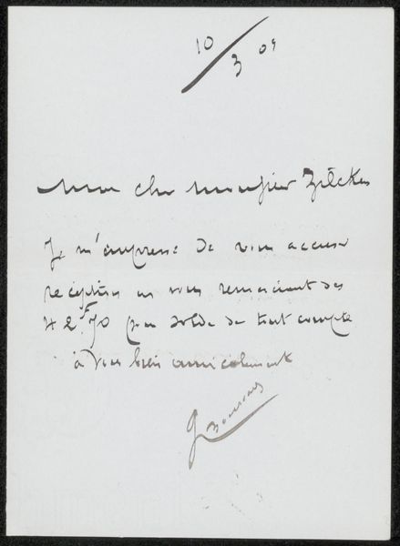 Curator: This piece, tentatively dated to 1892, is titled "Brief aan Jan Veth" and was rendered by Antoon Derkinderen, using pen and ink on paper. My initial impression is one of immediacy. It feels spontaneous, a captured moment of communication. Editor: Curator, it has this quiet gravity. All the looped strokes give it an ephemeral feel. The text, written in the Dutch language, seems so delicately placed. As if the very weight of the words could damage the page! Let's consider the context. Curator: Absolutely. This letter points to a crucial social and intellectual circle. The materiality itself speaks to a time when correspondence was a valued craft, requiring skill in penmanship and careful attention to the production and consumption of paper. The very act of writing implies a certain intimacy. Editor: Intimacy is key! And to be invited to glimpse it. I sense Derkinderen’s humour and personality through that cursive hand. It feels like a little inside joke we are almost able to catch. Did Derkinderen favour these kind of informal materials regularly? Curator: Derkinderen's drawing reveals a thoughtful use of line and shading. The letter gives insight into late 19th century artistic networks. What was this Jan Veth's significance? How were art communities created during those days of change in art's methods of production? This all adds meaning to the artist's craft. Editor: Knowing what an audience makes of these materials tells us so much about our values and what is to be deemed culturally and artistically "of worth", so it always strikes me how relevant this work is today when you are trying to place a hierarchy on methods. Curator: It indeed makes us consider the ever-evolving nature of artistic value. Well, this has offered some exciting insights. Thank you. Editor: It certainly has. These traces of time hold surprising depth.