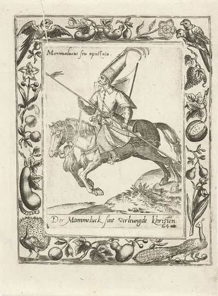 This print, *Parthische ruiter* by Abraham de Bruyn, was made in the late 16th century. It depicts a Parthian horseman, an image that encapsulates the fraught relationship between Europe and the East. Bruyn, a Northern Renaissance artist, created this print during a time of increasing global awareness and, simultaneously, growing cultural biases. The Parthians, known for their skilled cavalry, were often viewed through a lens of Roman and later European, perspectives. They were seen as both exotic and a threat. Notice the decorative border of fruits, flowers, and animals. These elements speak to a European fascination with the abundance and perceived ‘otherness’ of the East. How does this contrast to the rider, who is actively engaged in war? This image invites us to consider how historical depictions can shape perceptions of entire cultures, often reducing complex histories to simplistic, and biased, narratives.