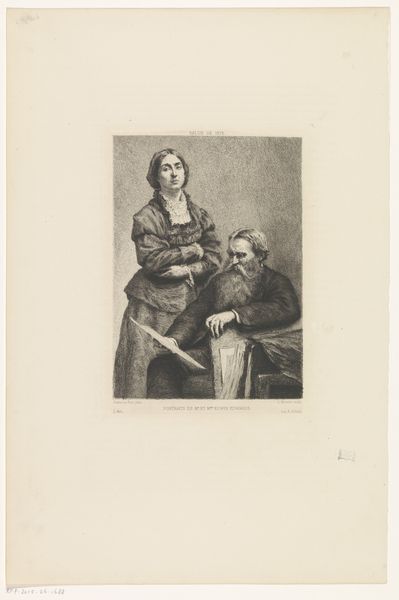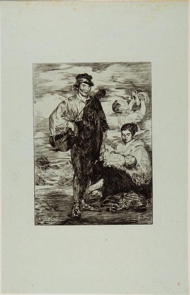 Editor: Hermann Struck's print, Heimatlos, presents two figures rendered in stark black and white, evoking a sense of profound sadness. What narratives of displacement and identity do you see woven into this piece? Curator: This image, whose title translates to "Homeless," speaks volumes about the precariousness of belonging, especially during times of political upheaval. Consider the historical context: Struck, a Jewish artist, created this work during a period of rising antisemitism in Europe. What feelings do you get from that knowledge? Editor: It deepens the sense of vulnerability and foreshadows the tragedies to come. Curator: Precisely. The etching technique itself, with its sharp lines and contrasting tones, mirrors the stark realities faced by those rendered stateless. Do you think Struck's identity influenced his artistic choices here? Editor: Absolutely. Knowing his background adds another layer of meaning to the figures' expressions. I now see the title as a statement of fact, a prophecy, and a lament. Curator: Indeed, it encourages us to reflect on how art can be a powerful tool for social commentary and personal expression.