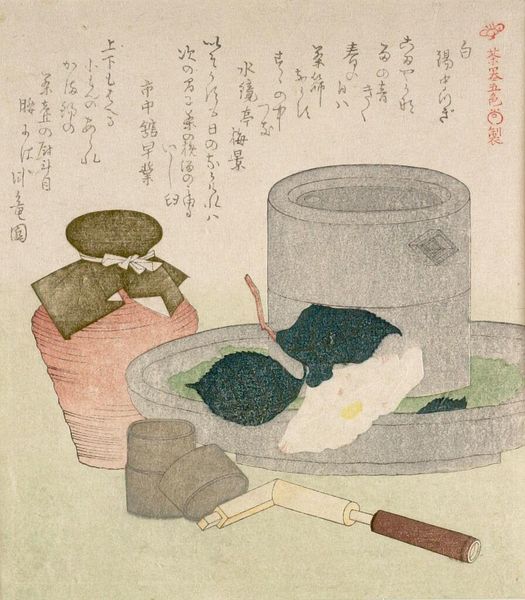 Kubo Shunman created this woodblock print, White, in Japan during the Edo period. This was a time of relative peace and flourishing arts. Shunman, working within the Ukiyo-e tradition, often depicted the refined life of the merchant class and the pleasure quarters. Here, we have a still life, seemingly simple, yet rich with cultural significance. Tea was not just a beverage, but a central element in social and artistic gatherings, symbolizing harmony, respect, purity, and tranquility. The objects, from the tea caddy to the delicate leaves, speak of ritual and aesthetic appreciation. Note the inscription of elegant script; the integration of poetry and image was common in Ukiyo-e prints. These elements come together to evoke a sense of calm and cultivated taste. Shunman uses this intimate portrayal to communicate a deeper understanding of the values and artistic practices of his time. It’s an invitation to consider the quiet beauty found in the everyday, and the cultural meanings we ascribe to it.