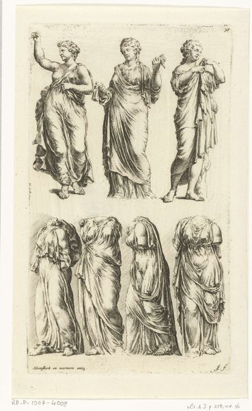 Curator: Jacques de Gheyn III created this study sheet, titled "Six Studies of an Old Woman's Head." The work is currently held at the Harvard Art Museums. Editor: It's undeniably haunting. The stark lines create a sense of vulnerability, almost as if we're intruding on a private moment of reflection, or perhaps, resignation. Curator: De Gheyn was working within a tradition of studying physiognomy. Artists explored the idea that outward appearances reflected inner character. Editor: But whose character are we really seeing? Is it hers, or the artist's projection onto her aging body? There's a real power dynamic at play here. The gaze feels decidedly male, perhaps even clinical. Curator: It is worth noting that such studies were instrumental for artists, offering insights into human anatomy and expression. They served as vital references for larger compositions. Editor: Absolutely. And that's where it gets complicated. This image becomes part of a visual language that can perpetuate harmful stereotypes about aging women, reducing them to symbols of decay rather than complex individuals. What narratives are being built on her image? Curator: These images invite us to consider the relationship between artistic skill, social observation, and maybe even societal biases. Editor: Yes, precisely. Art provides a lens, but it’s our responsibility to consider what that lens is showing us, and what it might be obscuring.