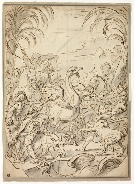 Curator: Right now, we're looking at "Die Zeit raubt den Ruhm" a drawing attributed to Christoph Jamnitzer, done in ink, graphite, chalk and coloured pencil on paper. Editor: Wow, what a dynamic sketch! I feel this intense feeling of fleeing, as if a beautiful moment is being snatched away... there's a melancholic sense of lost glory. Curator: The title translates to "Time Steals Fame," which sums up the scene nicely. Chronos, or Time, is depicted with wings, and he’s seizing a female figure, the personification of Fame, while a horse gallops away. Editor: I see, it really is a battle for remembrance. And to the left, there’s another figure carrying what appears to be a torch and... a heart? Curator: That’s correct. It adds another layer to the allegorical struggle between Time and lasting recognition. The heart probably represents love or passion, elements Chronos might also diminish. I see it all tied to a broader humanist reflection. Editor: It's the quick, expressive line work that grabs me. You can almost feel the movement, the frantic energy. Notice how the contours aren’t precisely defined; it feels like a snapshot of a fleeting concept. The texture created using the chalk technique certainly reinforces a transient temporal landscape. Curator: I agree completely. Jamnitzer has captured this idea of how things disappear and become fainter and how art must respond to temporality. Editor: I’ll definitely walk away contemplating what it is that I wish to preserve from time’s relentless theft. What about you? Curator: For me it raises such potent thoughts about the power and perils of our own actions! I shall take from it that nothing lasts, even drawings.