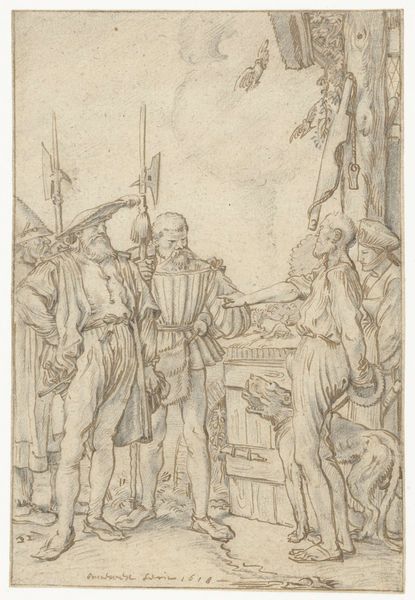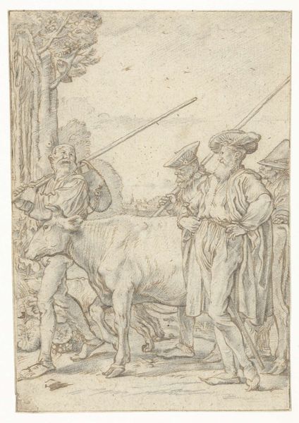 This pen and brown ink drawing, by Willem Pietersz. Buytewech, depicts a bailiff leading away a cow. The cow, often seen as a symbol of nourishment and agricultural wealth, is here, a focal point of economic or punitive action. The motif of livestock confiscation echoes through history, appearing in legal and social contexts across cultures. Consider the parallel with ancient Roman tax collections, or even biblical scenes of sacrifice and atonement, where livestock plays a central role. This image taps into our collective memory of agrarian life and the inherent vulnerabilities tied to it. The act of taking away a farmer’s livelihood can be seen as a primal form of social control, engaging viewers on a deep, subconscious level. The cow—a figure so central to life—becomes a symbol of loss, engaging collective and historical memory in a powerful way. It is a stark illustration of power dynamics and the precarious nature of sustenance.
