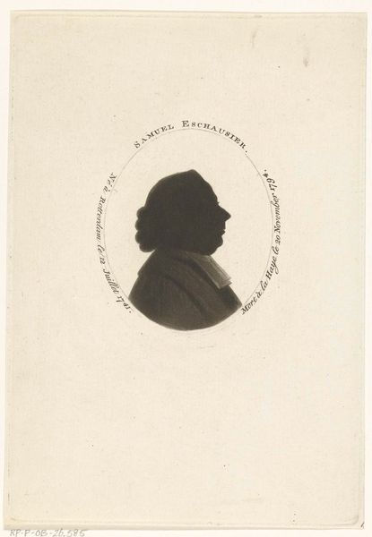 Curator: Looking at this silhouette portrait, one is immediately struck by the precision and economy of line. The starkness of the black ink against the off-white paper creates a very specific visual rhythm. Editor: And a social statement, perhaps? This is a drawing of Hedwig Catharina Wimermark created sometime between 1787 and 1808 by Jan Brandes, so it is being produced during a time of huge political upheaval. Who was she? Why was she important enough to be memorialized in such a way? Curator: A crucial point, definitely! In terms of the material handling, though, the execution here is wonderful. Observe how the artist uses varied pressure to define the edge of the silhouette, giving it a crisp yet subtle sense of depth and roundness. The use of line in the hair—it’s just phenomenal. Editor: True, the hair, while abstract, definitely commands attention and status. But consider the historical context. This woman is depicted against a very clean, classical oval. Brandes creates a portrait of this woman at a very volatile historical moment; perhaps it is a subversive statement itself that is playing on gender, on class, on social unrest. Curator: While I grant that context is indeed important, and agree the classical frame situates the subject within a specific intellectual tradition, one really cannot disregard the inherent value of the work's composition. It's really lovely. The way the artist balances the darkness of the silhouette with the lightness of the surrounding paper…it's all quite pleasing. Editor: It also makes me wonder, did Wimermark have a political voice of her own? I wonder if we can interpret this artwork as pushing against constraints for women. How does this image act within a historical timeline of shifting gender roles and power dynamics? The details are less important, to me, than its cultural value and its statement. Curator: I concede that its societal meanings cannot be disregarded. Looking closely at its construction, it definitely makes me re-evaluate how historical silhouettes and portraits more broadly really pushed and played with formal visual languages. Editor: Right. I hope listeners walk away today thinking about the myriad forces, visible and invisible, that give art historical context and continued meaning.