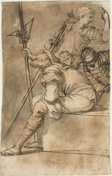 Giovanni Battista Piranesi made this drawing of A Young Man with a Staff with pen and brown ink on laid paper. It exemplifies the immediacy of ink as a medium, capable of capturing the dynamic pose of the figure with speed and fluidity. Piranesi’s method emphasizes line to define form, using hatching and cross-hatching to build up tone and volume, and the fibrous texture of the paper peeks through the ink, adding depth to the composition. The rapid, expressive strokes suggest the artist's engagement with the subject, reflecting the tradition of ‘alla prima’ which values spontaneity and directness. While seemingly simple, this drawing required technical skill and understanding of anatomy and perspective. Piranesi was trained in architecture, stage design, and printmaking, and this diversity is reflected in his work through his dramatic compositions and mastery of line. Ultimately, this drawing invites us to appreciate the artist’s dexterity, demonstrating how through careful observation and masterful execution, a simple medium can capture a wealth of expression.