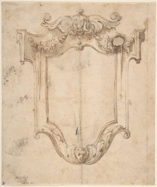 Editor: This is a drawing entitled "Design for Escutcheon, with Musical Instruments," date unknown, by an anonymous artist. It's rendered in chalk on paper. The monochrome palette gives it a subdued feel. I wonder, what is its message, or what should we think about when considering it? Curator: This design for an escutcheon presents a fascinating look into the ways that power and identity were constructed and performed. What strikes me is the absence, the void at its center. An escutcheon is meant to display a coat of arms, a clear marker of lineage, property, and authority. What does it mean to present such an elaborate frame around nothing? Editor: It seems to suggest that what matters is how things look. What’s interesting is that we have musical instruments. So are we all being asked to play a part or stage ourselves in some way? Curator: Precisely! Think about the role of music in courtly life, performances meant to solidify hierarchies, and promote certain values. Who got to play, and who was forced to listen? Whose stories were amplified, and whose were silenced? Even the way musical instruments were depicted – often highly symbolic – played a crucial role in reinforcing social norms or, sometimes, subverting them. Editor: So this isn’t just a pretty drawing; it is a social and political statement? Curator: Potentially, yes. Or, at least, it reflects the complex dance between outward display and inherent meaning. The blank space within the ornate frame is less about a literal absence, and more about a call for constant questioning and interrogation of what these symbols represent. Editor: That’s a new way of seeing it. It makes me think about modern day interpretations. Thanks for broadening my perspective. Curator: And thank you for bringing your fresh eyes and sharp insights. It’s in these dialogues that we truly unearth the rich layers of history embedded in art.
