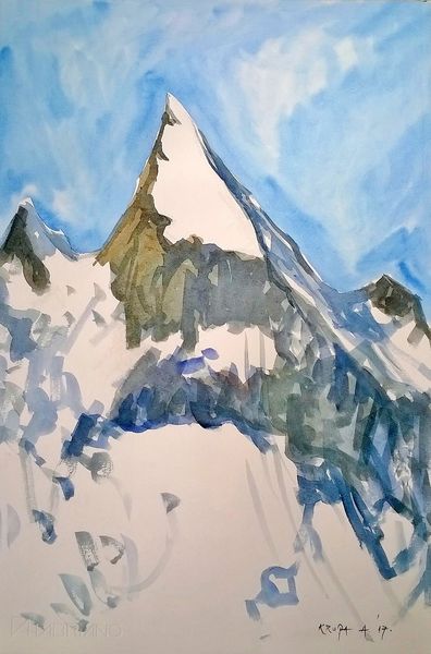 Curator: Let's discuss Ernst Ludwig Kirchner's watercolor, "Bridge in Landwassertal," created in 1919. It's an evocative piece currently housed at the Aargauer Kunsthaus in Switzerland. Editor: My immediate impression is one of almost violent dynamism. The color palette seems simple—blues, greens, and reds—but the execution…it's fractured, feverish, and captivating. Curator: Absolutely. We see Kirchner grappling with post-war anxieties here. After suffering a mental breakdown and undergoing treatment, Kirchner moved to the Swiss Alps. This landscape became his new subject matter. His service during the war deeply impacted his work as an artist and as a human. The bold use of color is characteristic of Expressionism and the artist's pursuit to capture the complexities of the human condition. Editor: And observe how the lines, though fluid as befits the watercolor medium, contribute to this tension. Notice the jagged peaks of the mountains. The bridge itself, a symbol of connection, is almost violently rendered. It hardly soothes with a gentle passage. It pushes the viewers. Semiotically speaking, even symbols such as bridges take a violent quality that relates to post-war disillusionment. Curator: Yes. The figures walking on the bridge could be interpreted as survivors navigating a landscape forever changed by trauma, and his return from a sanitarium. Kirchner certainly knew of these things. Editor: Trauma visualized, undeniably. One can feel the emotional burden carried by the artist, transferred directly onto the page with these bold washes of pigment. He masterfully conveys a state of mind using very deliberate arrangements. Look at how the brushstrokes mimic the forms that populate this natural space. This harmony between nature and human feeling elevates this artwork to a new type of perception of the human-animal symbiosis. Curator: It is remarkable how Kirchner managed to weave such personal experiences into what appears, on the surface, to be a serene landscape. Through Kirchner’s artistic practice we might have an insight to the lasting trauma endured by an individual experiencing this sort of trauma. Editor: It leaves one pondering how intensely personal the act of perception can be. It provides insight to ourselves too.
