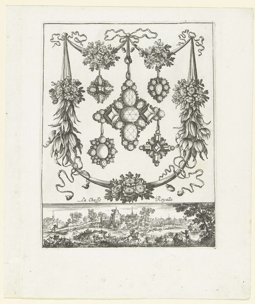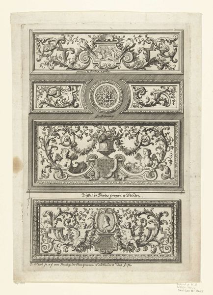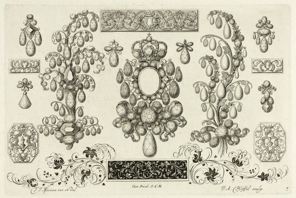 This is a plate of watch face designs created by an anonymous artist. Observe the many variations of emblematic images that harken back to classical antiquity, echoing the Renaissance interest in the antique world. Notice the recurring motifs—coats of arms, vases, and crowned figures, all rendered with meticulous detail and balanced symmetry. The inclusion of heraldic symbols reflects a society deeply invested in lineage and status, and this artistic language appears in other decorative arts throughout history. We can also see classical figures. Note how the figures re-emerge during the Renaissance, imbued with new layers of meaning, reflective of the changing cultural and intellectual landscape. This act of revival is not merely a replication of form but a reinterpretation of the past through the lens of the present. These symbols resonate with a collective memory, revealing the cyclical nature of cultural expression.