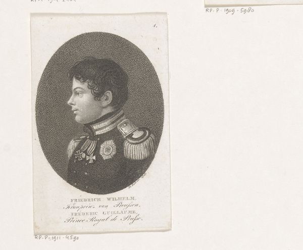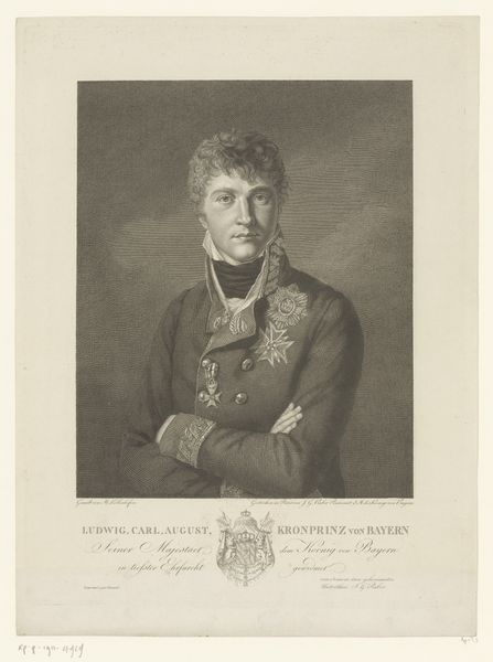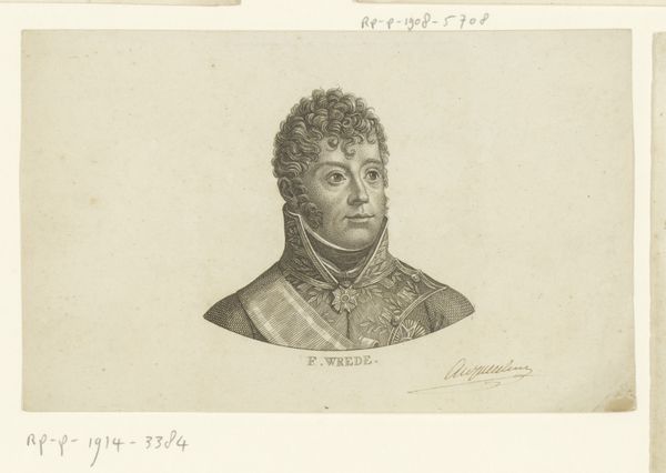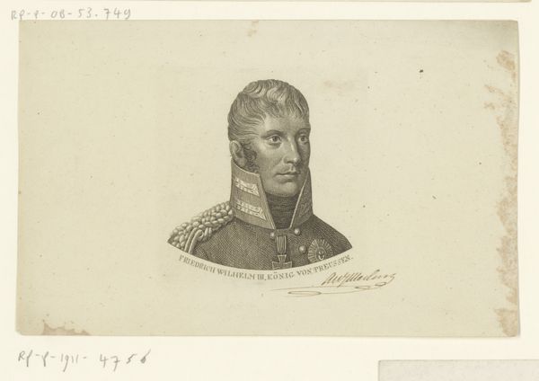 Editor: This is an engraving titled "Portret van Willem I, koning van W\u00fcrttemberg," created by Ernst Ludwig Riepenhausen, likely sometime between 1775 and 1840. It seems like a fairly straightforward portrait, but there’s a certain… stiffness to it, wouldn’t you say? What’s your read on the piece? Curator: Indeed. Focusing on purely visual terms, we note the rigid symmetry, characteristic of Neoclassical portraiture. The subject's posture, the formal attire, and even the hair are meticulously rendered, conveying a sense of controlled dignity. Editor: So, the "stiffness" I felt aligns with that control? What do you make of the limited tonal range? It's almost entirely grayscale. Curator: Precisely. The artist prioritizes line and form, leveraging the stark contrast to delineate shape and texture. Consider how the intricate details of the uniform – the braids, buttons, and high collar – are carefully articulated. These elements draw the eye and contribute to a sense of formal precision. Do you see how the engraver employs hatching and cross-hatching to create tonal variations? Editor: Yes, now that you point it out, I see the way they've built up those darker areas, especially around the face and uniform. Curator: Furthermore, observe how the composition emphasizes the subject’s gaze. The artist has created a focal point, compelling us to confront the sitter directly. There’s a certain unemotional detachment. What feeling does this elicit in you? Editor: I suppose it lends an air of authority, or maybe even a bit of coldness. I find myself analyzing those precise lines now, more than just seeing a portrait. Curator: Exactly. And that is the essence of this work: a visual structure of power and controlled representation, rendered through careful, calculated lines and forms. Editor: Fascinating. Looking at the portrait now, I appreciate the intent and artistry far more deeply. Thank you for sharing your perspective!