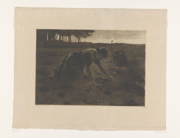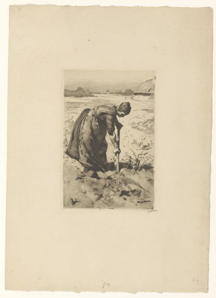 Curator: This etching is entitled "Young Goat Herder Sitting in the Field" by Max Liebermann, likely created between 1857 and 1935. Look closely, it's on toned paper, worked with pencil and light strokes. What's your immediate impression? Editor: Melancholy. Definitely a quiet sadness in this tiny world. It feels like a half-remembered dream, the kind you strain to recall. Curator: It’s more than just a pretty picture, isn't it? The goat herder with goats far in the distance, could the young goat herder be the “ everyman?" Editor: That cap she's wearing! Such an icon. Throughout centuries the figure with that type of cap becomes an universal signifier to mark figures with low means that work hard in the field, especially in rural paintings. Curator: Absolutely. There’s this quiet stoicism in how Liebermann portrays her. It connects her, and perhaps all of us, to that historical lineage of toil. And those distant goats—they’re so faintly drawn they almost disappear. What do they mean? Editor: Could they be representative of our goals in life or other human beings; faint dreams or echoes that we must work through the hardships to grasp and nurture and cultivate a garden full of opportunity from these mere ideas of goats. It's a hard existence portrayed delicately through the style of impressionism. Curator: And there's something comforting about that portrayal, though, isn’t it? In his distinct style and approach to landscape, the work is a beautiful depiction of finding peace even in difficult situations. Editor: Indeed, Liebermann gives a window into a seemingly private, personal, yet highly representative scene, turning personal into an echo that vibrates into culture and universal recognition of hard working people around the globe. The quiet fortitude—captured in those faint pencil lines—is surprisingly powerful. Curator: It does linger, doesn’t it? More than just a field and a figure; it is the impression of an era. Editor: Beautifully observed; yes. And a perfect reminder that quiet strength often speaks the loudest.
