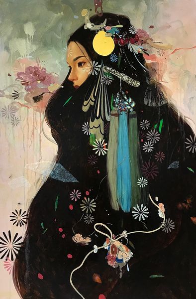 Daria Theodora’s ‘The Story Weaver’ is a 20th-century rendering of myth and identity, painted with delicate detail. The artwork invites us into a world of interwoven narratives, hinting at the complex relationship between identity, nature, and storytelling. We see a figure adorned in a robe, an amalgamation of natural and symbolic motifs, suggesting a confluence of personal and cultural histories. The figure's gaze, both ethereal and grounded, embodies the tension between lived experience and the stories we inherit or create. The piece acknowledges the historical and social forces that shape our identities. Consider how the artist uses elements of fantasy to reflect on the pressures and expectations placed on individuals, especially women, within societal structures. The Story Weaver offers not only a reflection on the past, but a call to reimagine the narratives that define us.