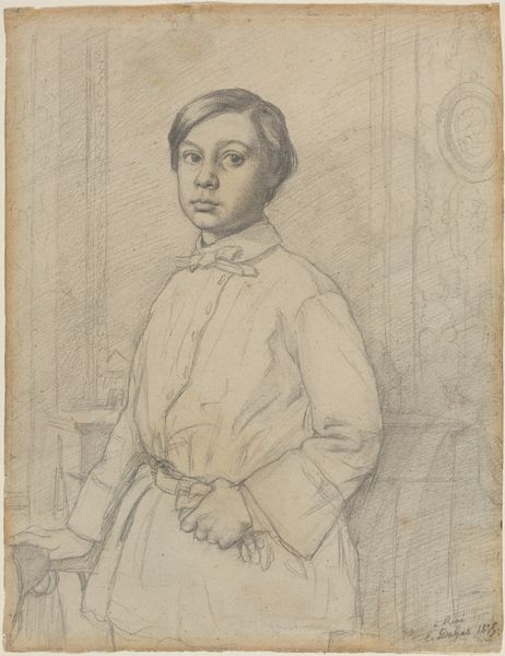 Curator: Here we have Wilhelm Girtner's 1845 portrait of Joseph Joachim, housed here at the Art Institute of Chicago. It’s a compelling work rendered with gouache, ink, and graphite on paper. Editor: It certainly has an immediate, almost unsettling intimacy to it. There's something about the muted tones and slightly averted gaze that feels quite vulnerable, like we're intruding on a private moment. Curator: Note how Girtner employs a limited palette, focusing primarily on earth tones contrasted with the crisp white of Joachim's collar. It draws the eye to the face, emphasizing the precision of line and modeling that create his likeness. We see masterful manipulation of light and shadow, characteristic of Romantic portraiture. Editor: It’s interesting to consider Joachim's later prominence as a renowned violinist and composer. This image predates his fame. I'm curious about the potential power dynamics at play in its creation. Joachim was only a teenager. Did he have agency in how he was presented? Was this portrait commissioned to elevate his status, or was it merely an exercise in representation for Girtner? The whiteness, in the form of a white shirt that he dons, adds to Joachim’s almost aristocratic outlook on display. Curator: Perhaps, but the technical facility on display shouldn't be ignored. The subtle gradations in the rendering of his hair, the soft blush on his cheek—these details elevate it beyond mere representation. It also demonstrates considerable skill in print production. This is where technique elevates craft. Editor: Agreed, but technique is never neutral. Art serves—knowingly or unknowingly—dominant ideologies. The formal elements are composed through the lens of gender and social class, the soft lines reinforcing a certain image of bourgeois masculinity in 19th century Europe. Looking closely, I cannot shake off the thought that Girtner attempts to establish certain social norms within society and time. Curator: So, where I appreciate the interplay of line and tone in depicting the youthful features, you focus on its possible historical implications? Editor: Exactly! This work offers us a space to explore how representation intertwines with power. Thank you for opening up the space. Curator: And thank you, for inviting a social conscience and political awareness, without sacrificing the artwork's material integrity.