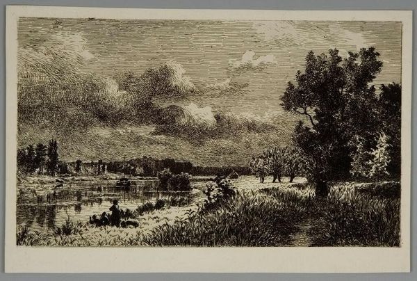 Curator: Marie Alexandre Duparc, born in 1760, offers us a glimpse into pastoral life with his piece, "A Meadow Irrigated by a River." It is currently held in the Harvard Art Museums. Editor: This etching evokes a profound sense of serenity; the grayscale tones create a tranquil and almost dreamlike atmosphere. Curator: Considering the period, and the representation of livestock integrated into the landscape, it speaks to agrarian ideals, class, and the romanticization of labor. Editor: Absolutely, one can imagine the artist etching each line, painstakingly building up the textures of the trees and the water's reflective surface. The process mirrors the slow, deliberate pace of rural life. Curator: And perhaps speaks to the power dynamics between the artist, the land, and the rural subjects depicted. Editor: Indeed. It leaves me pondering the relationship between artmaking and lived experience. Curator: It emphasizes how deeply historical context shapes artistic interpretation. Editor: It reminds us how materials and methods tell stories as much as the images themselves.
