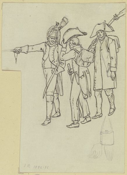 Editor: This is "Russian Infantry," a pen and ink drawing by Franz Pforr from the 19th century. It has an almost unfinished quality to it, but there's something really stark about these soldiers. What do you see in this piece, especially considering its historical context? Curator: Well, on the surface, it seems like a straightforward depiction of military figures. However, let’s consider the early 19th century - a time of revolution, Napoleonic wars, and shifting national identities. Who were these soldiers really fighting for, and what did their service represent? Were they agents of state power, or conscripted participants in a brutal system? How might the lack of detail and unfinished quality of the drawing speak to the human cost often obscured by the glorification of military history? Editor: That’s interesting, I hadn't thought about it that way. It looks very...academic, but you're making me question what's *not* being shown. Like, were they part of some larger colonial endeavor, and how does Pforr, as the artist, fit into that power dynamic? Curator: Precisely. It’s also essential to recognize that this was a time of nascent nationalism. The artwork's title gives us "Russian" infantry. Were these men willingly fighting for this ideal of a unified Russia? What narratives about bravery or duty were imposed upon them? And what other, often marginalized, stories might their image erase? The representation of conflict and violence always raises difficult ethical questions, about who gets to tell the story and whose perspectives are prioritized. Editor: So, it's not just a drawing of soldiers; it's a historical document that raises critical questions about power, identity, and representation? Curator: Exactly. By situating “Russian Infantry” within the political and social landscape of its time, and then examining those roots through the lens of contemporary theory, we see how seemingly simple images can become powerful tools for exploring broader narratives of history, identity and power. Editor: That really shifts how I see this drawing, makes it so much more than just a historical record. It's a challenge. Curator: It certainly is! And these challenges help us consider perspectives and uncover meanings which often get obscured in traditional art history narratives.