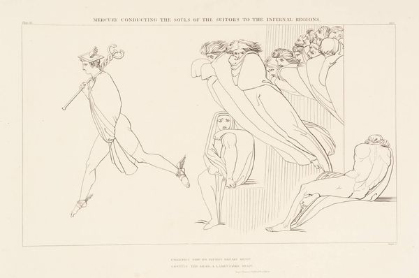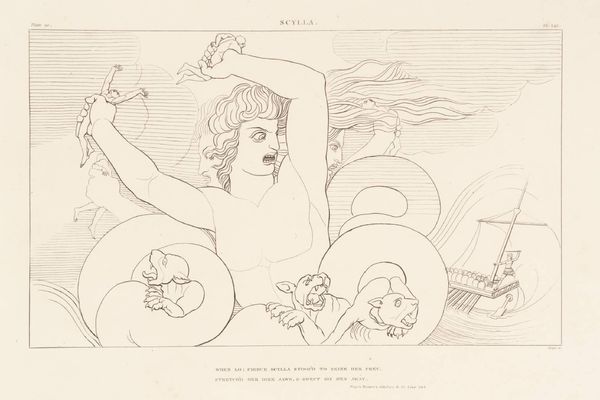 Editor: This is John Flaxman's "The King of the Lestrigens Seizing One of the Companions of Ulysses." It's a striking image, the simple line work and stark subject matter create a brutal scene. What can you tell me about it? Curator: The materiality of Flaxman's work is key. Consider the process of printmaking, a relatively accessible medium at the time. How does the mass reproducibility influence our understanding of the classical themes depicted? The lines themselves speak to production, echoing industrial processes and challenging notions of unique artistic creation. Editor: That’s interesting! So, the *making* of the image is as important as the story it tells? Curator: Precisely. The starkness, the mass production, all reflect a changing social landscape and questions the elite status of high art. Editor: I never thought of it that way. Thanks! Curator: My pleasure!