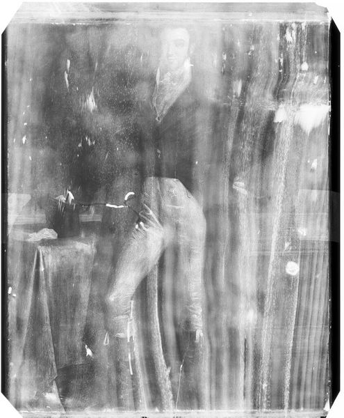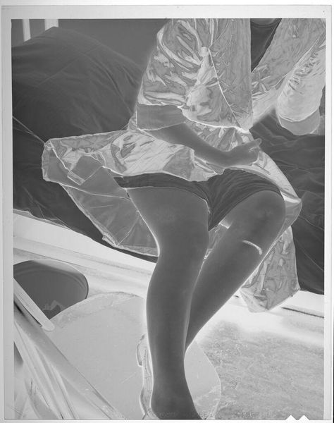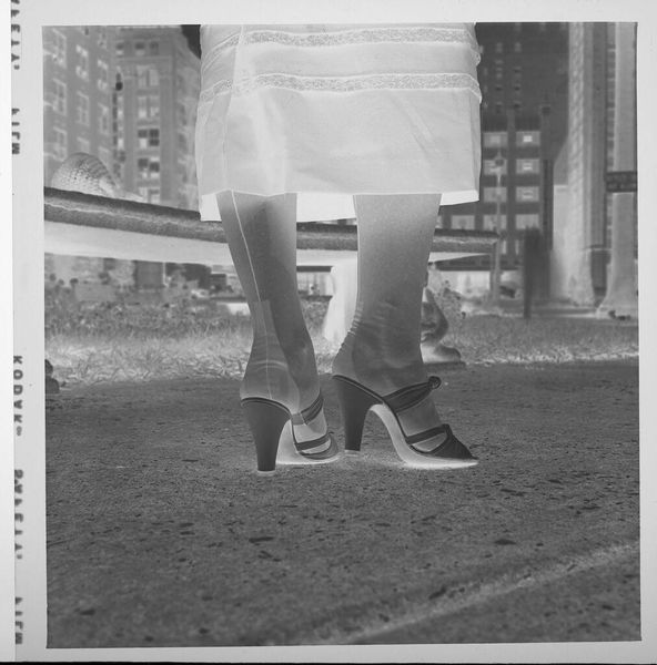 Curator: This photograph by Jack Gould in the Harvard Art Museums captures a woman's crossed legs and shoes. It's compact, almost square. What strikes you first? Editor: Ethereal. Like a dream captured in monochrome. The shoes look like glass slippers, and the inverted tones give it an otherworldly vibe. Curator: The negative image transforms the ordinary—shoes, legs, and a garden statue—into something strange and surreal. It challenges conventional ideas of beauty and representation. Editor: Exactly. And that disembodied feeling gets you wondering about identity, how much the photograph reveals or withholds. The darks and lights playing off each other feels like that push and pull. Curator: The snapshot aesthetic adds to its charm. A little voyeuristic, perhaps? Editor: Maybe. It’s a gentle reminder that art can be found in the most unexpected perspectives. Curator: True. It makes you question the nature of reality. Editor: A perfect conversation starter, wouldn’t you say?