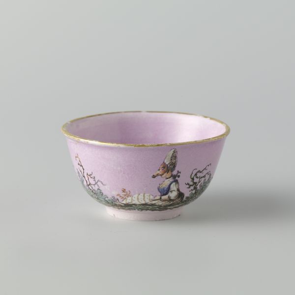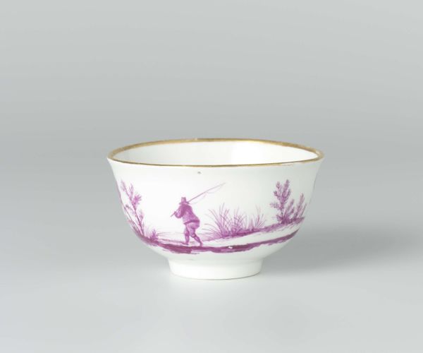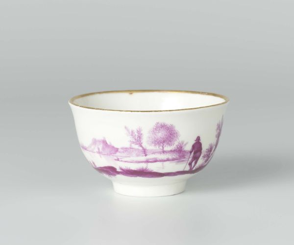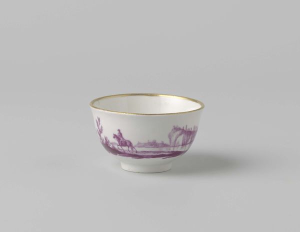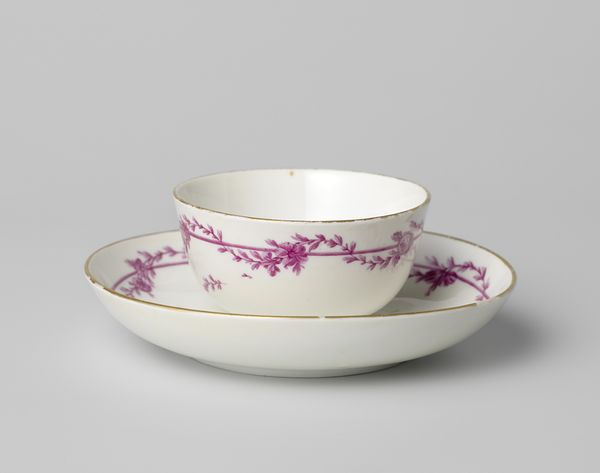 Editor: Here we have 'Kop zonder oor,' a porcelain bowl from around 1780, crafted in Loosdrecht. I find the delicate floral band surprisingly grounding, given its rococo origins. How would you approach interpreting its visual structure? Curator: Focusing solely on its formal qualities, the spherical form is bisected horizontally by the stylized band of botanical motifs, creating a dialogue between pure geometry and organic ornamentation. Note how the repeating rose and leaf pattern dictates rhythm and the considered spacing emphasizes negative space. Editor: It’s interesting that you highlight the rhythm. I was struck by the simplicity of the decoration in contrast to the perceived extravagance often associated with rococo. Is there more to that? Curator: Indeed. Consider the use of color: a restrained, singular purple, which, along with the delicate gilding on the rim, accentuates, yet does not overwhelm, the pristine white porcelain. Observe the careful craftsmanship and precise execution. This simplicity in design might be interpreted as a movement away from the more ostentatious examples of Rococo. Do you notice the slightly worn edges of the gold lining? Editor: Now that you mention it, yes. It appears to soften the sharpness of the porcelain and adds a time element to the whole composition. Curator: Precisely! Furthermore, note that the subtle imperfections further challenge any notion of absolute perfection and encourage us to engage with the bowl's intrinsic materiality. Editor: It is amazing how looking at the form, color, and even imperfections can give you a new insight into the design itself! I see how formalism really helps to explore design choices.
