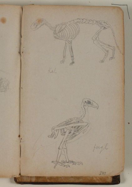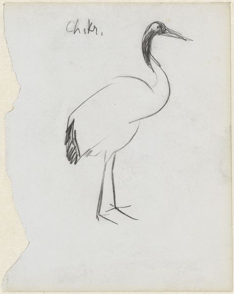 Curator: This is a pen and ink sketch titled "Ooievaars", which translates to "Storks," by Gerrit Willem Dijsselhof, dating from around 1904-1906. It’s currently part of the Rijksmuseum's collection. What strikes you first about it? Editor: The simplicity. There’s a starkness to the storks depicted with such minimal lines, almost like a child's drawing, yet somehow full of inherent grace. The storks evoke this primal connection to nature, and feel like archetypes of birds, reduced to their essential forms. Curator: Indeed. It feels almost like a glimpse into the artist's personal sketchbook, a momentary observation captured on paper. There’s also an interesting tension at play. The larger stork seems self-assured, whereas the smaller one is rather meek. Editor: Storks have, for centuries, been potent symbols of birth and new beginnings in various cultures. I wonder if Dijsselhof intended to tap into this universal symbolism, using these iconic birds as messengers of hope or transformation at a time of changing social values. Curator: That's fascinating. He may have certainly been aware of those ingrained associations. The lack of contextual detail adds to this impression— they are representations rather than realistic portrayals. The question that really interests me, then, is how such seemingly basic sketches found their way into the permanent collection of a national museum like the Rijksmuseum. Editor: Perhaps it’s the rawness, the unrefined energy of the sketch that makes it so appealing. The unpretentious lines lend the sketch its immediacy, breaking through the layers of academic formality often associated with classical art. The quick strokes give a vitality often unseen in overly polished pieces. Curator: Possibly, there is a certain honesty to the form. Works like these also reveal the cultural contexts within which the artist was creating; one wonders how the storks—and their implied associations with fertility or purity or something else entirely— resonated at the time. Editor: Absolutely, it’s a perfect study in the evocative potential held within seemingly simple images. A true showcase of how fundamental symbolism can convey more significant ideas than complex realism sometimes allows. Curator: I find myself looking at how public art institutions collect and interpret such pieces, especially sketches, when evaluating their function in constructing our art histories. Thank you for helping me look deeper into it.
