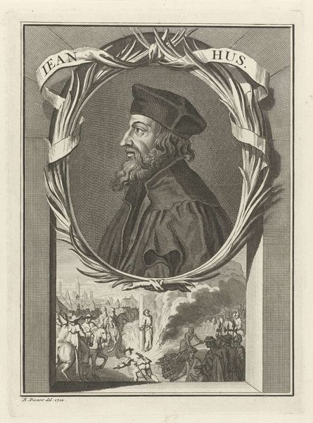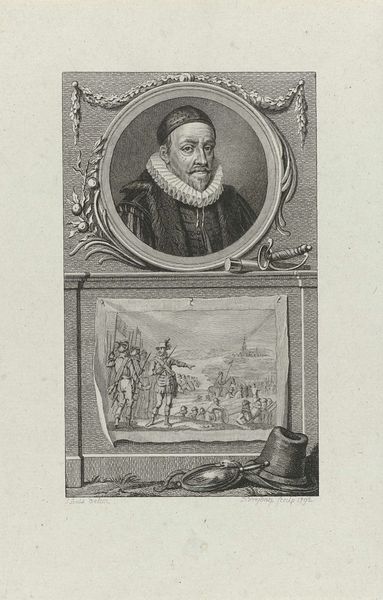 Editor: Here we have Jacob Houbraken's engraving, "Portret van sir Edward Seymour", dating from between 1736 and 1738. The detail is amazing; you can almost feel the texture of his clothing. I am curious about the structure of the image and its aesthetic relationship between the sitter and the historical vignette below; how do you interpret this work? Curator: From a formalist perspective, let's examine the composition. Notice the strong, almost theatrical, Baroque framing device around the portrait. It draws our eye immediately to the face, but then complicates our perception through the detailed, yet smaller, historical painting presented beneath. The contrast between these two spaces creates a compelling tension. Observe how the artist employs the play of light and shadow. Where does the light originate, and how does it sculpt the forms? Editor: It seems to be coming from the upper left, highlighting Seymour’s face and creating deep shadows on the right side of his cloak and hat. The rendering almost lends a certain sense of weight or depth in those darker segments. What does it tell us? Curator: Precisely. This strategic use of light serves to dramatize the figure and draw attention to specific features like his stern gaze and carefully rendered beard. Also, consider the varying line weights in the engraving process itself. Some lines are delicate and feathery, suggesting soft textures. Other lines are bold and decisive, defining contours and creating visual anchors. Notice how these elements create both a sense of realism and a subtle distortion, maybe an expression, depending on our reading. Editor: The formal structure seems to actively interpret and influence my perception, more so than neutrally representing him. I hadn’t considered the light itself contributing to such subtle expression. Curator: Indeed. By focusing on the interplay of line, light, and composition, we gain a deeper understanding of how Houbraken conveys not just a likeness, but also a distinct impression through careful and precise design. This exploration underscores the richness found within a single engraved portrait. Editor: It's amazing how much meaning is packed into the composition, and I see how crucial close visual analysis is for interpreting art. Curator: Quite. There is always much to discover by analyzing the artwork and understanding its structure.