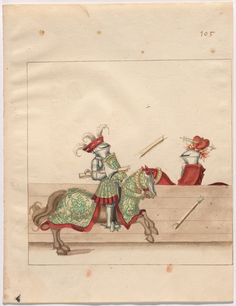 Editor: Here we have an intriguing colored pencil drawing titled "Italian Joust of Peace," created around 1512-1515 by an anonymous artist during the Italian Renaissance. It feels… oddly lighthearted for a jousting scene. What catches your eye in this piece? Curator: My attention is drawn to the swan crest adorning the jouster's helmet. In the Renaissance, swans often symbolized purity, grace, and light, but also solitude. Do you see any tension between this imagery of grace and the inherently violent act of jousting? Editor: I hadn't considered that! I was focused on the red, white, and blue stripes – almost like a flag – adorning the horse, thinking it symbolized some kind of...patriotism, maybe? Curator: Possibly, but those colors and patterns could be symbolic of allegiance to a particular house, family, or ideal rather than nationalism. Think about what red, white, and blue represented symbolically during that era, independent of modern associations. How might viewers have interpreted them? Editor: That's interesting... red for courage, white for purity, blue maybe for loyalty? Seeing the fallen jouster – almost comical in defeat – alongside that swan crest makes the drawing seem more about ideals than about warfare itself. Curator: Precisely! And consider the joust as a ritual performance. It isn't just about the clash of lances, but the theatrical display of values. What lasting messages do you think such staged performances were intended to transmit? Editor: Maybe it’s a reminder that even in conflict, certain virtues or principles should prevail. Thanks, I'm definitely seeing layers here I completely missed at first glance! Curator: Indeed. Visual symbols serve as potent tools for shaping memory and communicating cultural continuity, transcending even the immediacy of the event itself.