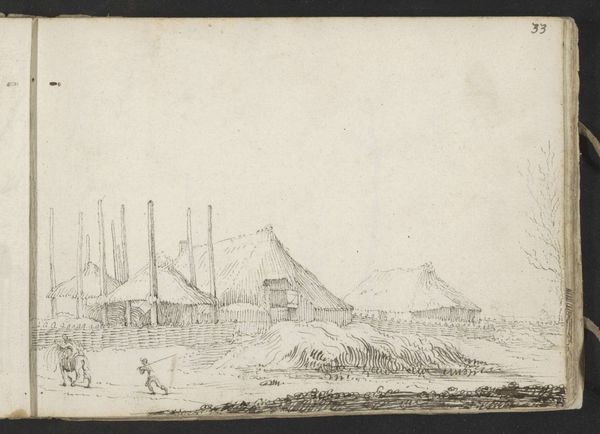 Curator: Look, here’s an ink drawing on paper that grabs my attention. It’s titled "Weg mit zwei Häusern am St. Anthonisdeich"—which, if my Dutch serves me, means "Road with Two Houses on the St. Anthonis Dike." The piece is from the Städel Museum’s collection and is attributed to Abraham Furnerius, working sometime in the 17th century. Editor: Oh, right away it's got this hazy, almost dreamlike quality. Sort of melancholic. You know, those two little houses huddled there… Makes you wonder about the lives lived within those walls. Feels very intimate, almost a whisper of a place. Curator: Absolutely, that intimacy resonates with me too. Furnerius uses a limited palette, focusing on tonal variations to create depth and atmosphere. Notice how the landscape almost merges into the sky, blurring the line between earth and the heavens? Editor: The blurring creates that sense of the eternal. Like this little pocket of human activity, the houses, is really just a temporary structure within the larger, unchanging landscape. I like the strong verticals in the design—those sticks around the larger haystack seem to echo, on a domestic scale, obelisks of memorial or power, and, in a very practical manner, might serve to deter thieves or vermin. Curator: That's a fascinating interpretation. It could symbolize permanence, but also vulnerability, wouldn’t you say? The houses are small, simple, seemingly at the mercy of the elements. But still proudly asserting themselves on the horizon line. There is a sense of steadfastness too. It's also so immediate. This had to be a quickly executed work, not something overly labored or idealized. Editor: Right. Quick, sure, and that immediacy has this raw, emotional quality. What does it symbolize when artists include their landscape? Perhaps the artist’s desire to depict the symbiosis of human life as it intertwines with the forces of nature? I almost wish it were raining. I'm curious, looking again: Is it melancholic? Or am I just projecting a need for simplicity in our fast-paced lives onto this quaint, humble sketch of another world? Curator: That's something to ponder, isn't it? Maybe this little drawing simply asks us to slow down, appreciate the small things, and contemplate the passage of time in these landscapes that always feel bigger than ourselves. Editor: Yeah, that feeling of the immense resting just beyond our fragile constructed boundaries, something ancient watching us pass through a moment. Thanks, Abraham.