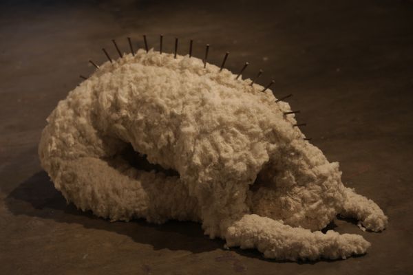 Curator: Well, hello, and welcome. Before us is an "Untitled" artwork, a mixed-media construction, including fiber and textile, by the artist Eva Hesse. Editor: It kind of startles you, doesn't it? It has this weird, almost repulsive attractiveness. Something like deep-sea creature someone pulled from the ocean floor...vaguely organic, but unsettling. Curator: A suitable reaction, given the postminimalist inclinations of Hesse and her peers, working with unconventional materials to evoke emotional responses to simple forms. Note the almost perverse simplicity, the tension between soft volume and trailing lines... Editor: Yeah, the draping lines are really what got me. They’re almost mournful. There's a gravity in their hanging...I wonder, is that Hesse exploring emotional states? Curator: Absolutely, and also drawing on abstraction's established ability to speak about something beyond what is visible to the casual eye. By allowing her artistic process to become visible to us through the wrapping string, the rough surface...Hesse lets us see the struggle for the finished work. Editor: Right. There's a tension I get with it. Like the outside—what we see—only tells part of a more complicated story, so what's underneath becomes so important, because we almost can see that. Does that make sense? Curator: Perfectly. That sense of implied narrative and veiled meanings is central to how we might consider her engagement with phenomenology. Editor: Oh, okay! So, with the materials like textile and cord... there's a real presence to them, almost tactile and sensual? Curator: Precisely! It has an intimate, bodily presence and that subverts against classical sculptural ideals that have previously valued permanency. It’s meant to decay and transform, you could almost call it impermanent. Editor: You're right, which turns that repulsion I first felt into a kind of tenderness. Okay, now it is starting to grab me. Thank you, the sea monster is revealing her secrets... Curator: Agreed. This untitled sculpture shows just how versatile simple shapes become with complex relationships. Editor: This just goes to show that art is meant to be an ongoing encounter...you can come back to an artwork like this years later and be in a completely different mindset.