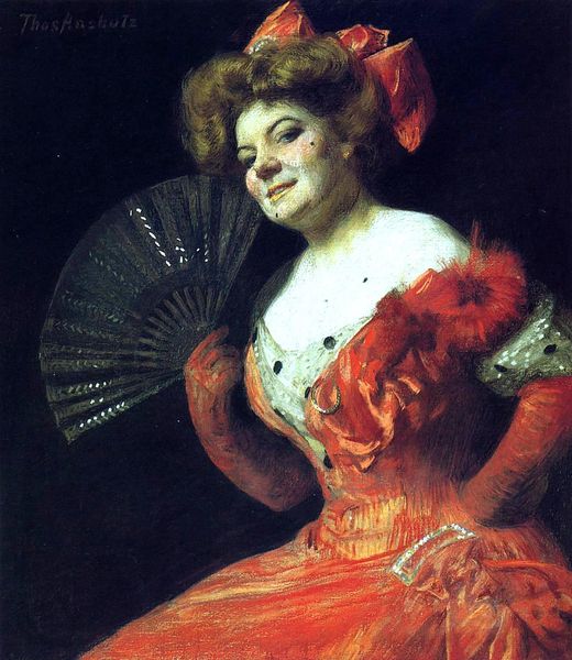 Curator: What a serene scene! We're looking at Eugene de Blaas’s painting, "Daydreaming," created in 1890. It's oil on canvas. Editor: Yes, a lovely composition. At first glance, I'm struck by how it captures a sense of quiet introspection, almost melancholic, despite the vibrant colors in her clothing and the fan. Curator: De Blaas was known for these genre scenes, particularly depicting Venetian women in idealized settings. The clothing she's wearing and the red fan situate this within a very specific cultural context, hinting at leisure and a certain social standing. It's the Gilded Age version of "soft life aesthetic". Editor: I see that. It also makes me think about the politics of representation. Who gets to be represented in art and how? Is she merely an object of beauty, or is there something more to her daydreaming? Her upward gaze feels knowing and almost defiant. Curator: That defiance is perhaps subtly conveyed. De Blaas, working within the academic art tradition, walked a fine line. He needed to please his patrons, yet his paintings offered glimpses into the lives of ordinary people, capturing details of their everyday existence and the impact of socio-economic conditions. Editor: True. The textures of the dress seem particularly deliberate, conveying both affluence and restriction. The color story also makes me curious. The contrast between the yellow bow, orange fan, and the earthy wall makes this painting very intimate and lively. Curator: Absolutely. There’s an artful manipulation of color and light at play, typical of the Realist and Romantic elements within his academic approach. It catered to popular tastes. De Blaas himself came from an artistic family with academic ties that made the road for exhibiting paintings, and gaining traction, very accessible. Editor: Considering the historical context, it's interesting to ponder her own power or lack thereof. What dreams are deemed acceptable or achievable for someone in her position, visually striking and positioned in the height of aesthetic appreciation, in 1890, I mean? Curator: That’s a poignant question. Ultimately, “Daydreaming” operates on multiple levels, as it is both an enchanting scene and an echo of a time shaped by strict social norms and budding class-based cultural shifts in the art world. Editor: Exactly. A valuable reminder of art's complex relationship to the real world.