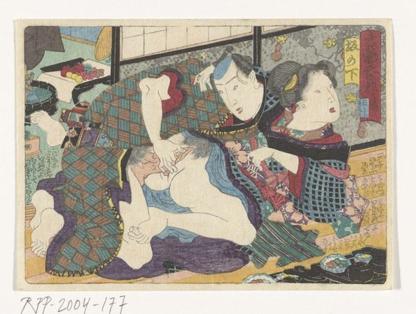 This is 'Pleisterplaats van de Tokaido', a woodblock print made by Utagawa Kunisada, a leading printmaker in 19th century Japan. Kunisada was a key figure in the Ukiyo-e movement, which flourished during the Edo period. Ukiyo-e, meaning "pictures of the floating world", often depicted scenes from everyday life, including landscapes, theatre, and erotica. These prints were not just art objects, but also a form of popular culture, reflecting and shaping the tastes of the urban middle class. Our image, with its explicit subject matter, would have circulated within a specific social context, likely among affluent urbanites with a taste for the risqué. What’s particularly interesting is how these images challenge our conventional notions of public and private art. While seemingly intimate, they were mass-produced and widely distributed, raising questions about the role of art in shaping societal attitudes towards sexuality and desire. Understanding these prints requires us to delve into the social, economic, and artistic networks of Edo-period Japan. Luckily, extensive collections of Ukiyo-e prints and related documents are held in institutions worldwide.