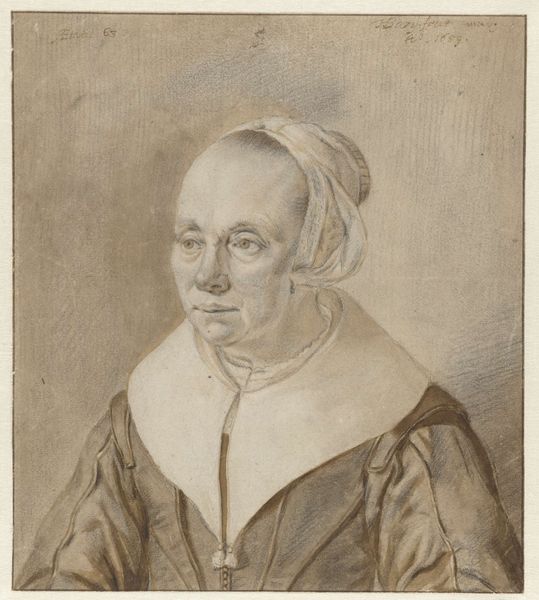 Editor: Here we have Jan Lievens' "Head of an old woman," created around 1630. It's a drawing, made with materials like charcoal, chalk, pencil and ink. It feels so intimate, with all of those textured layers. How do you read this drawing? Curator: The intrinsic power lies in Lievens’ deft handling of line and form. Note how he employs a restrained palette to evoke depth and texture, with layered strokes and contrasting application pressure, using graphite for precise definition while reserving softer material like chalk to contour shapes. This imbues the composition with visual tactility and enhances its atmospheric dimension. Editor: So it’s about the interplay between the techniques he’s using? Curator: Precisely. Consider, too, the significance of the starkly unadorned backdrop, contrasted by nuanced folds on the headpiece which amplify visual dimensionality. How might a less subtle deployment of visual resources effect this particular reading of human form and texture? Editor: I guess a different technique could result in different values to interpret the artwork and change the sense of closeness that it conveys. It's interesting to think about art in terms of fundamental elements like that. Curator: Indeed. By recognizing and appreciating its compositional architecture, we may better perceive an artwork's semantic richness. Editor: Thanks! It certainly gives you a deeper understanding of this work when considering the choices Lievens made to produce such image.