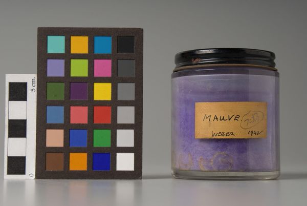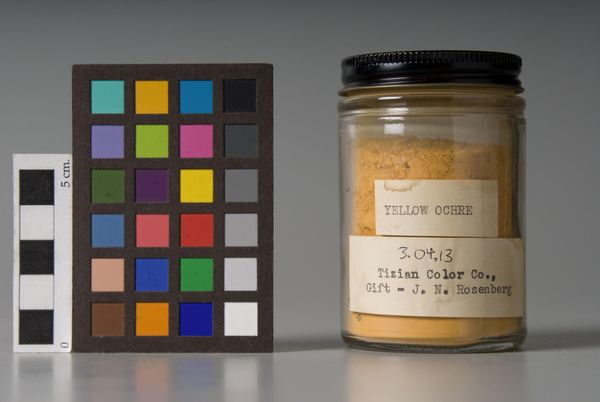 Curator: This is "Raw Sienna," manufactured by Tizian Color Co. What strikes you first about this piece? Editor: The jar has a quiet, earthy feel. The sienna pigment at the bottom appears settled, almost dormant. Curator: Indeed. Observe how the formal elements converge. The label, though aged, provides structure, juxtaposed against the amorphous pigment. Editor: That pigment evokes landscapes: the ochre soil of Italy or perhaps the American Southwest. It carries echoes of centuries of artistic practice. Curator: The composition itself—the jar, the label, the sienna—creates a dialogue between containment and potential. A tension between the manufactured and the elemental. Editor: It makes one consider color itself, as a symbol. The raw sienna suggests a foundation, an origin point from which infinite possibilities arise. Curator: Precisely. The object becomes not just pigment, but a meditation on art-making. Editor: It's fascinating how something so simple can contain so much. Thank you for pointing out such insights! Curator: The pleasure was all mine, noticing those structural and theoretical values!