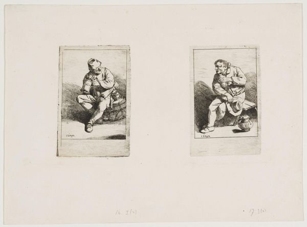 Editor: So, this is Pieter van Loon’s "Two Studies of a Soldier," a pencil drawing from 1842. There's a stark contrast between the two faces, like wisdom facing youth. What symbols do you see in this image? Curator: I see more than just contrasting ages; I see a visual dialogue about the very idea of soldiery in the Netherlands during this period. Notice how the older figure is worn, almost etched into the paper. Their face, deeply lined, seems to carry the weight of past campaigns, embodying experience, while the youthful face, softly rendered, suggests potential, hope perhaps, or even naïveté. It makes you wonder: What kind of stories would they tell about service? Editor: That’s a great way to put it – a dialogue. It also makes me think about the Romanticism movement at that time – and how they often talked about ordinary people as the emblem of authenticity and experience. Curator: Precisely! And consider the choice of rendering them as drawings, in pencil. It feels immediate, personal, less about idealized heroism and more about observed reality. It avoids glorification, leaning toward psychological observation. Have you considered what their head coverings might signify within their cultural context? Editor: I hadn't considered that particularly. Now that you mention it, perhaps the way each head covering is arranged – one looser, the other tighter – reflects their status or experience. I didn’t see that before! Curator: These kinds of minute details invite reflection and challenge our initial perceptions. This piece demonstrates the value of attending to what images have to say about emotional and cultural realities. Editor: Thanks for opening my eyes to seeing art as cultural dialogue. I appreciate your insights on this piece.