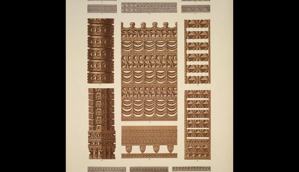 Owen Jones produced "Nineveh and Persia no. 3" during the height of the British Empire. Jones, an architect and designer, sought to codify decorative principles from various cultures into a universal design language. However, this endeavor needs to be seen through the lens of its time. As Europe expanded its colonial reach, there was a growing interest in the art and design of colonized regions, often appropriated and reinterpreted through a Western lens. Jones believed that understanding historical styles could lead to better contemporary design, yet this approach also risked flattening cultural nuances and reinforcing imperial power dynamics. How do we reconcile Jones' genuine interest in cross-cultural design with the complex politics of representation and cultural exchange inherent in his project? Ultimately, "Nineveh and Persia no. 3" prompts us to consider the ethics of cultural appropriation and the responsibilities that come with interpreting and representing diverse artistic traditions.