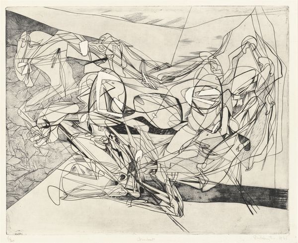 Stanley William Hayter created this etching titled 'Tropic of Cancer'. Hayter, a British artist, played a pivotal role in the Surrealist movement and the development of abstract expressionism, movements which often explored the subconscious and challenged traditional artistic representation. This work shares a title with Henry Miller’s novel ‘Tropic of Cancer’, published in 1934. Miller’s novel was celebrated but also faced obscenity trials for its frank depiction of human sexuality. Hayter's abstract lines and forms can be seen as a visual parallel to Miller’s prose, both challenging conventional boundaries. The swirling, energetic lines create a sense of chaos and complexity, mirroring the novel's themes of existential exploration and societal critique. As you observe this print, consider how Hayter uses abstraction to evoke emotion and challenge traditional narratives. The artwork reflects the societal shifts and artistic experimentation of the mid-20th century, inviting us to contemplate the relationships between art, literature, and cultural expression.
