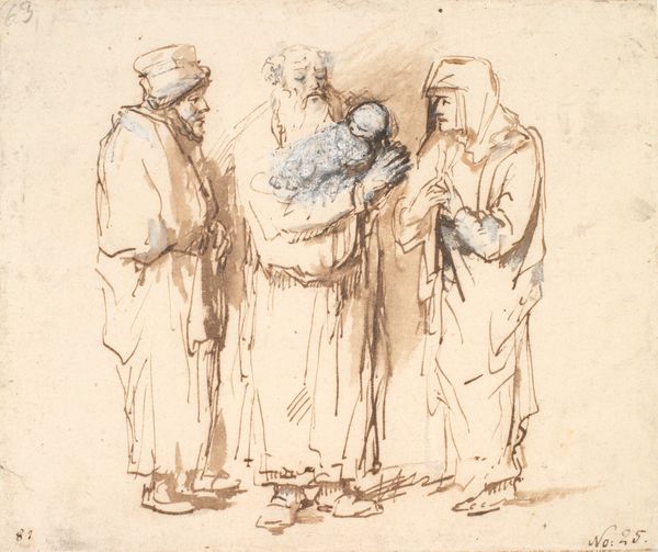 Jan Lievens created "A Group of Standing Monks and other Figures" using pen and brown ink. Notice the repeated motif of hands clasped or hidden within sleeves; gestures that speak volumes about inner piety and solemnity. The draped robes, reminiscent of classical togas, evoke both humility and the weight of religious tradition. This motif echoes in countless depictions of religious figures across time, from ancient Roman senators to medieval saints. Consider the gesture of covered hands. In many cultures, this conveys respect, reverence, or even concealment. We see it repeated in the poses of Egyptian pharaohs, Byzantine emperors, and here, in the humble monks. This gesture, passed down through generations, taps into a collective memory—a subconscious understanding of authority and deference. Such symbolic choices aren't accidental; they’re powerful forces engaging viewers on a deep, subconscious level. The progression of this symbol is not linear, it is cyclical, and the symbolic language resurfaces, evolves, and takes on new meanings throughout history.