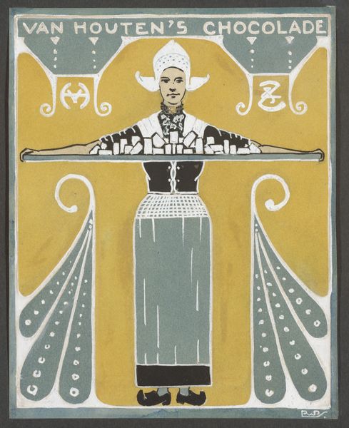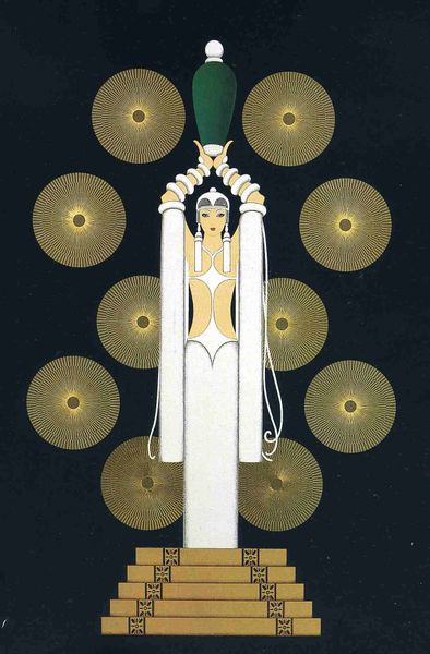 Editor: So, here we have Erte’s, "At the Theatre, Golden Calf". It's an art deco drawing, with a figure adorned with geometric patterns. I'm struck by how theatrical it feels – both grand and slightly unsettling. How do you interpret this work? Curator: It's fascinating how Erte blends Art Deco's geometric elegance with symbolic layers. The 'Golden Calf' reference immediately brings up themes of idolatry and misplaced worship. Given Art Deco’s rise during a period of rapid industrialization and shifting social values, might this image be a commentary on the dazzling distractions of modernity and their potential to blind us to deeper truths? Notice how the stylized figures almost seem suspended, manipulated… are they offering light, or trapped by the ritual? Editor: That's a really interesting point. I hadn't thought about the figures as potentially trapped or manipulated, I focused on the glamour. The golden calf as a symbol of modernity makes a lot of sense, especially considering the era. Curator: Precisely! Consider also how fashion and theatrical design played such prominent roles during this period. Erte’s work often blurred the boundaries between art, commerce, and performance, questioning established hierarchies. Does the theatrical setting imply a critique of societal performances, perhaps suggesting we’re all, in some ways, acting out prescribed roles? Editor: I see what you mean, like a commentary on the artificiality of societal roles. The idea of blurring boundaries makes me think of how Erte challenged gender norms through his designs. Curator: Exactly. This image invites us to consider art not just as decoration, but as a mirror reflecting our own social constructs, power dynamics, and the choices we make about what we value. Editor: I’ll definitely look at this drawing differently now. Thanks for shedding light on the historical and cultural context! Curator: It's a two-way street. Your insights help reveal new layers and interpretations as well. Art is a constant dialogue.