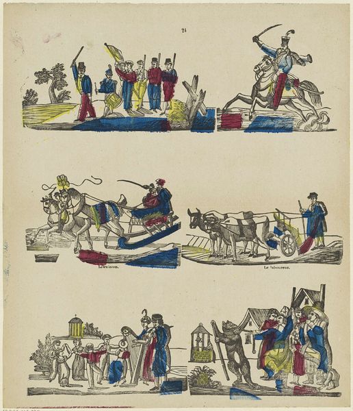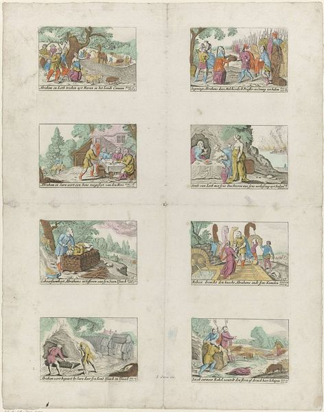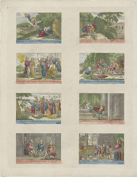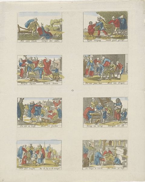 This print, Acht overwinningen van Frederik Hendrik, was made between 1629 and 1637 by an anonymous artist. It is made from laid paper, engraved and then hand colored with watercolor. The image is a series of small scenes, each representing one of Frederik Hendrik's military victories. The printmaking process was crucial in disseminating information and propaganda in the 17th century. Engravings like this one allowed for the mass production of images, making them accessible to a wide audience. The choice of laid paper as a support is also significant; it was a common, relatively inexpensive material, perfectly suited to the print's function as a widely distributed visual record. The labor involved in creating this print, from the engraver's skilled hand to the application of color, speaks to the broader economy of image-making in the Dutch Golden Age. The hand coloring adds an element of individual craft to the otherwise mechanically reproduced image. By understanding the materials and processes involved, we can appreciate the significance of this print as a cultural artifact, not just a work of fine art.