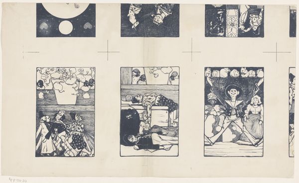 Curator: Standing before us is a print entitled "Tien incarnaties van de Indiase god Vishnu," created in 1723 by Bernard Picart. It is currently held in the Rijksmuseum. Editor: It's incredibly detailed, almost like a graphic novel page from the 18th century. The sheer number of figures and symbols makes my head spin a little. It has an ethereal feel but maybe that is because of the monochrome style, line engraving perhaps. Curator: Precisely. The work presents ten different incarnations of the Hindu god Vishnu, a powerful statement about cross-cultural representation and the colonial gaze. What stories and narratives were they attempting to convey with this piece at this moment in history? Editor: When you look closely, each section is crammed with detail, and that would involve someone manually incising these fine lines onto the printing plate. Given its repetitive nature and tight draughtsmanship I'm wondering how much collaboration took place. It's easy to see that labor materialized right on the paper and transformed to give this cultural output a material presence. Curator: Indeed. Think of the labor and global exchange networks required for production; the paper's manufacture, the engraver's tools, the distribution channels for the finished print. Picart, from his Western perspective, was engaging with complex non-Western religious iconography to address Enlightenment audiences. It forces one to think about the representation of power and how it manifests differently within disparate belief systems. Editor: It does push me to ask, whose narratives are elevated, whose labor is recognized, and how art reshapes perceptions? And while at first, it looked ethereal, the black lines contrast against the white which creates a dramatic composition when thinking about Vishnu's multiple forms. Curator: What is at stake when one culture attempts to translate another’s spiritual beliefs for their own consumption and understanding? Are we building bridges of understanding, or are we re-inscribing old power dynamics and prejudices in ink on paper? Editor: Definitely questions to consider as we examine our present through art. It all started by analyzing process, material and context, and seeing it through a materialist framework. It offers insight when confronting the political and social factors embedded in Bernard Picart's representation. Curator: A perspective like yours is useful when deconstructing how meaning gets built through historical and societal layers that connect these engravings with enduring legacies of both colonization and knowledge dissemination.